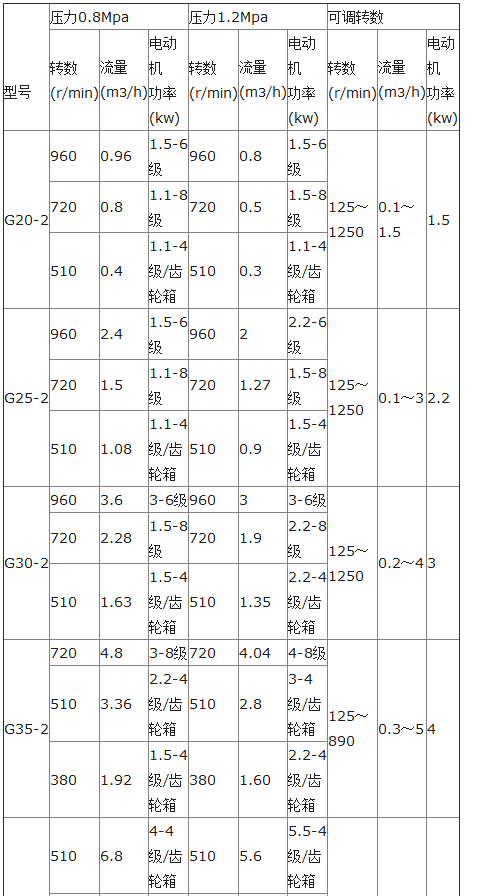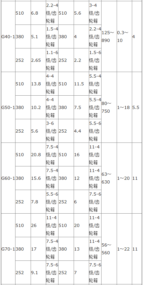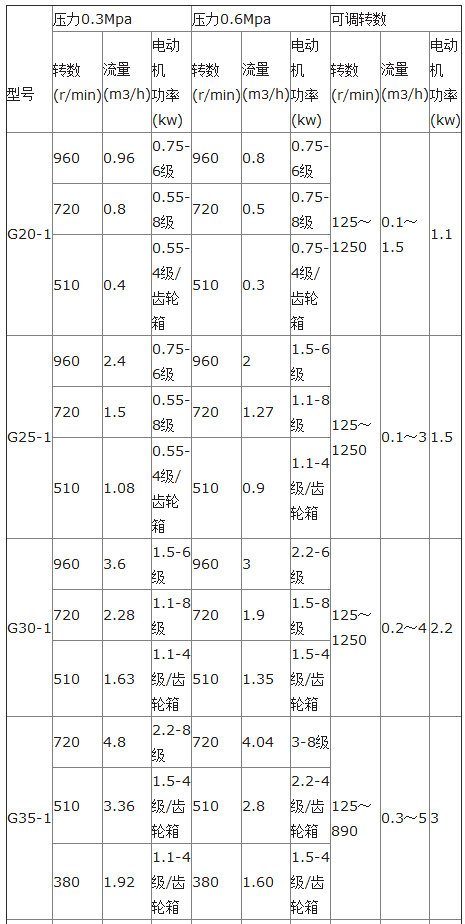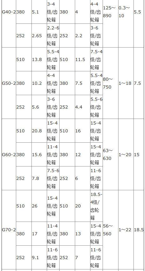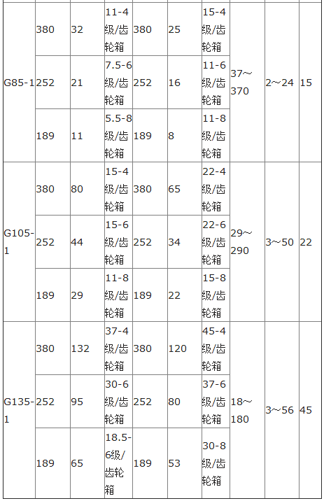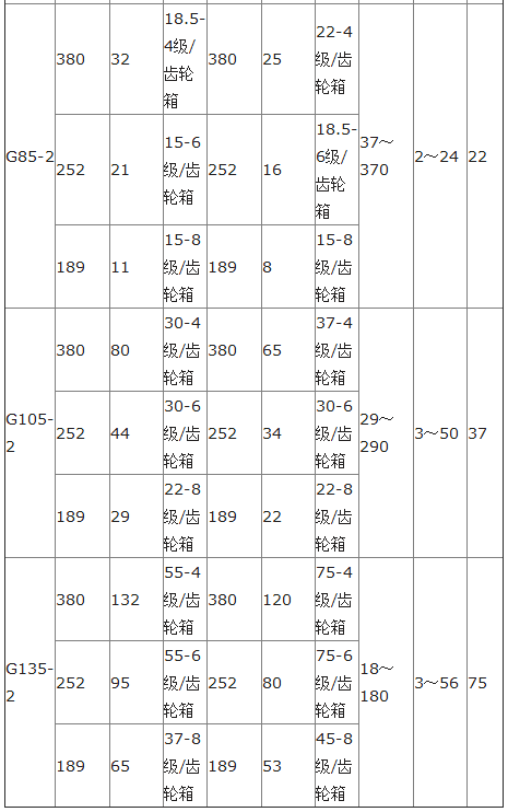 雙級(jí),由齒輪變速、電磁調(diào)速電機(jī)加齒輪變速或無(wú)級(jí)變速電機(jī)加齒輪變速時(shí)的性能參數(shù)