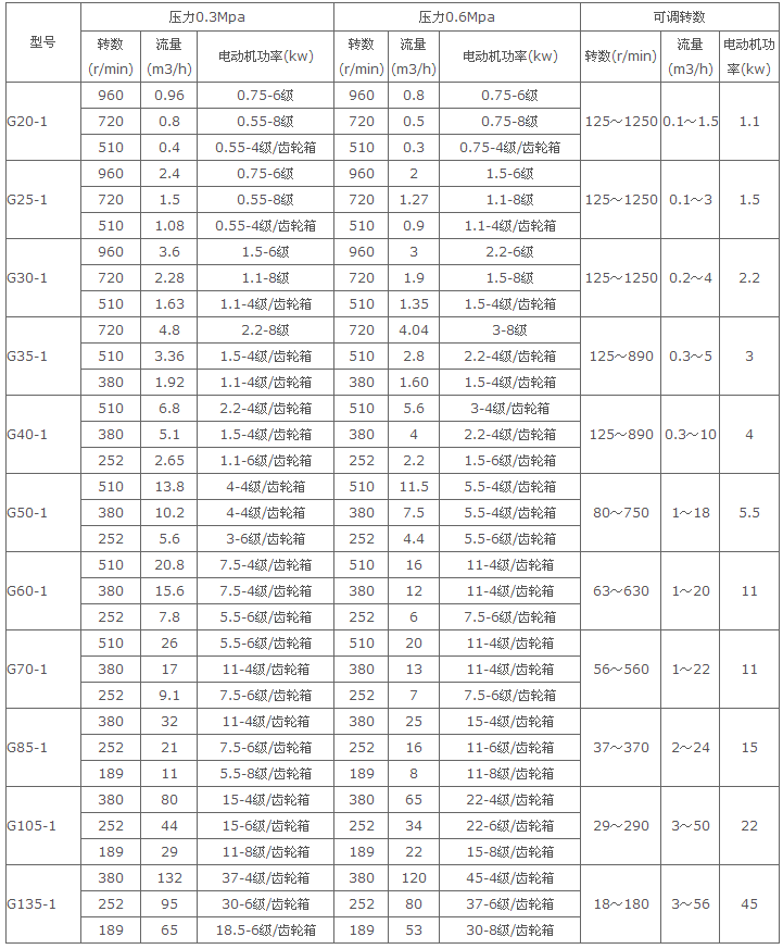 單級,由齒輪變速、電磁調速電機加齒輪變速或無級變速電機加齒輪變速時的性能參數(shù)